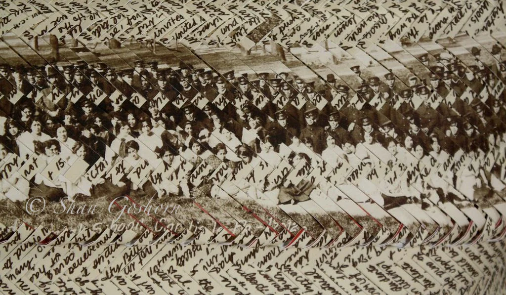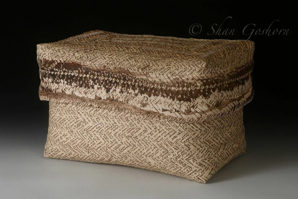 This double-weave basket (with lid) illustrates the impact boarding schools continue to have on Native people today. Exterior splints are printed with boarding school founder Captain Richard H. Pratt’s speech that coined the phrase “Kill the Indian, Save the Man”. The historical photograph is the Carlisle student body in the year 1912. The red interior (lid and base) was woven from the 10-12,000 names of children who attended Carlisle from 1879-1918. During my research I found the names of two of my great- grandparents.