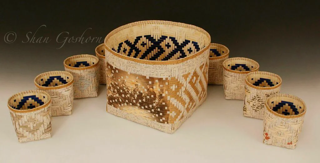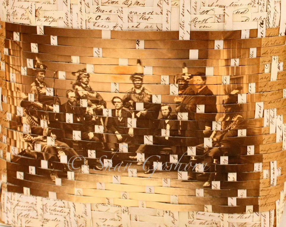 The Treaty of Medicine Lodge serves as the warp (vertical splints) for all of the baskets in this “dinnerware set”, combining additional treaties (specifically Navajo, California, Ft Wayne, Canandaigua, Horse Creek, Medicine Lodge, Muscogee and Potawatomi Treaties) with each of the smaller “bowl” baskets. The center “serving bowl” features a historical photo by Alexander Gardner (collection NMAI, Smithsonian Institution), showing a Sauk and Fox delegation with several US Indian commissioners. One of the delegates is holding a pipe, which most members of Plains Tribes insisted on smoking with the commissioners upon the conclusion of their meetings. To these Indians, smoking a ceremonial pipe elevated any negotiations or agreements to the level of the divine. To default on such a promise was to break a vow with God.
