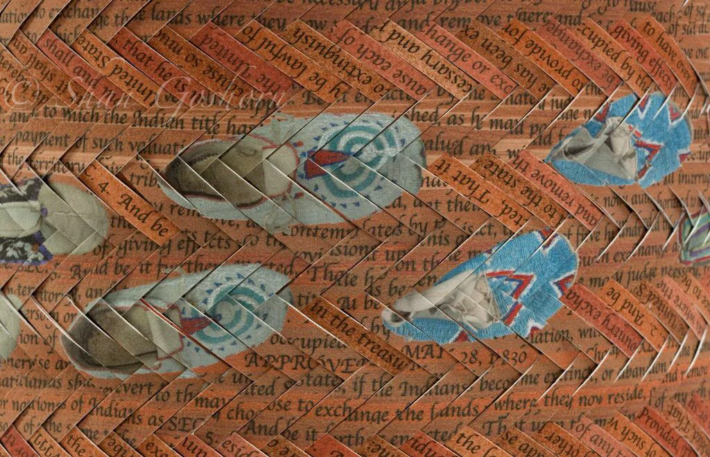 This traditional Cherokee double-weave style basket is woven from splints printed with the Indian Removal Act of 1830 (which gave President Andrew Jackson the power to negotiate land trades with SE tribes for lands “out west”). When tribes declined these offers, Jackson forced them to walk to Oklahoma, Indian territory.
